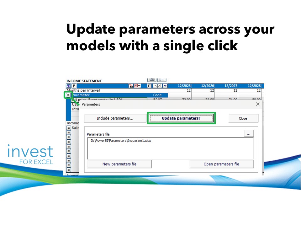 Invest for Excel® version 4.3 introduces a new parameter table that can be added to the Calculation files, to a designated section of Income Statement. Parameters can be entered directly or managed through centralized parameter files, making it easier to maintain consistent assumptions across calculations and update values efficiently.