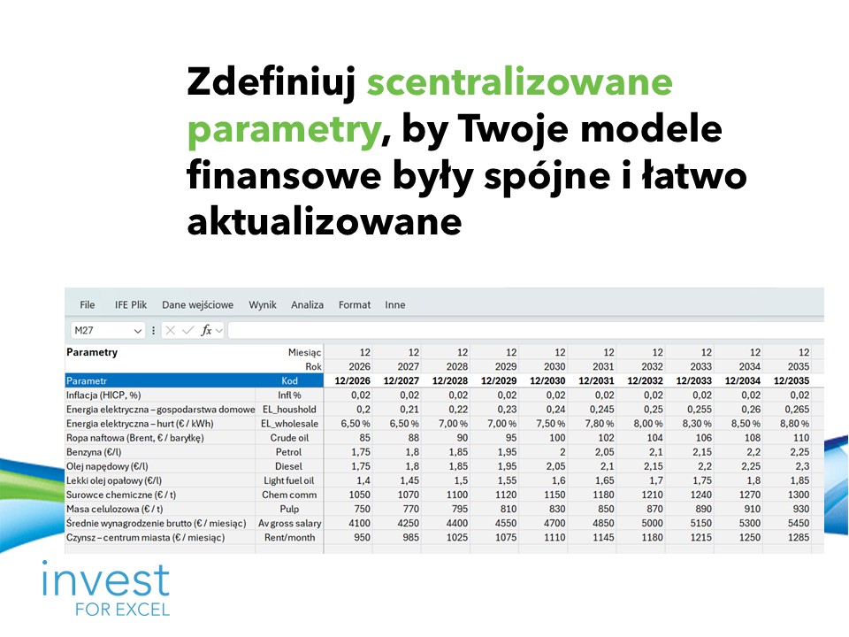 Parametry można definiować elastycznie i określać według potrzeb Twojej działalności, np. inflacja, prognozy cen energii elektrycznej, ropy naftowej, paliw, chemikaliów, celulozy, czynszów, wynagrodzeń, kursów wymiany walut i innych.