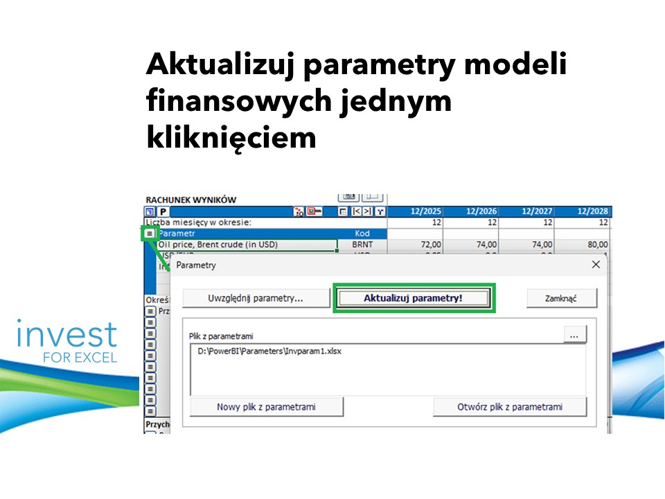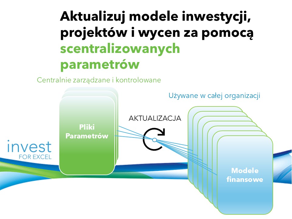 Parametry można wprowadzać bezpośrednio lub zarządzać nimi za pośrednictwem scentralizowanych plików parametrów, co ułatwia zachowanie spójności założeń w obliczeniach w całej organizacji i sprawną aktualizację wartości wynikowych w różnych modelach finansowych np. analizy inwestycji, projektów lub wycen.