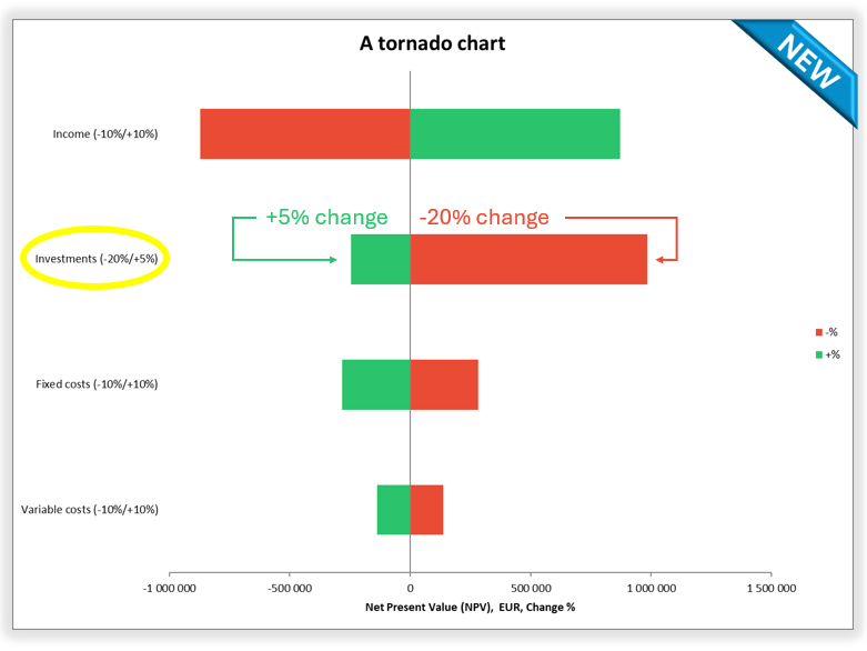 Du kan använda individuella förändringsprocentsatser i ett Tornado-analysdiagram. Välj den rad för vilken du vill ange individuella förändringsprocentsatser. Till exempel kan vissa variabler ha en förändringsinställning på +/- 10 %, medan andra har +/- 15 % förändring. Varje variabel kan ha en individuellt inställd förändringsprocentsats.