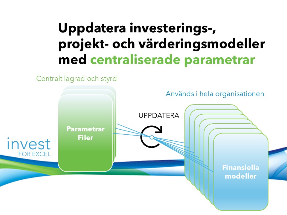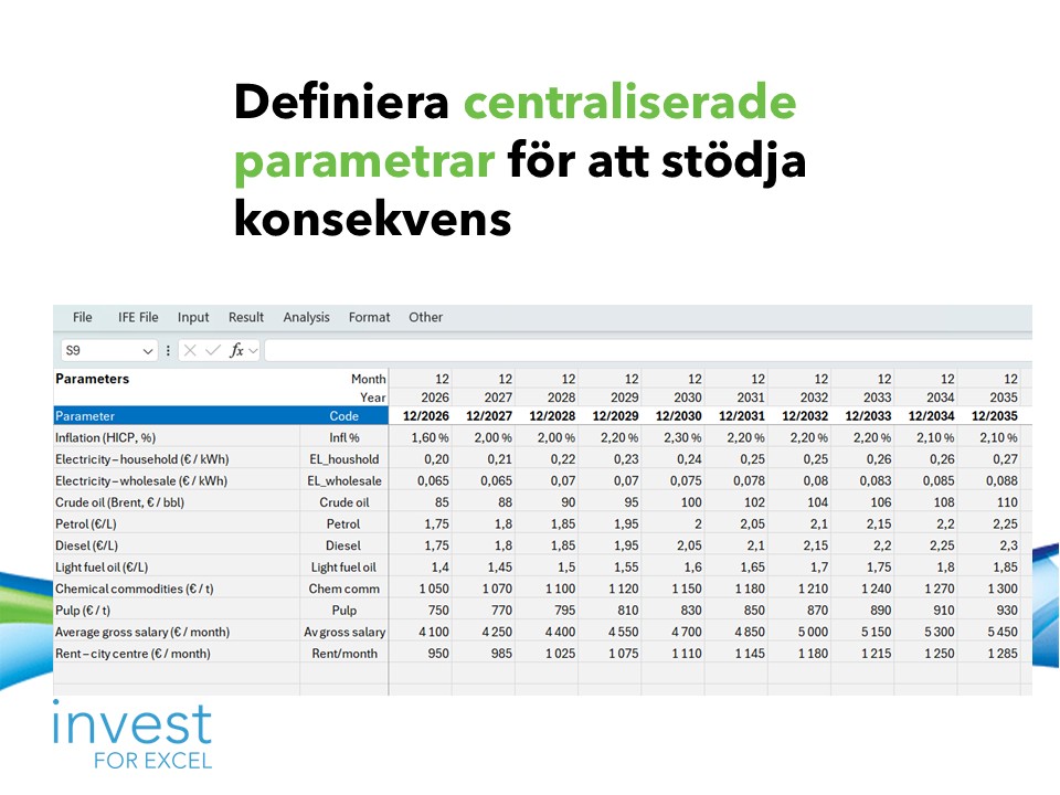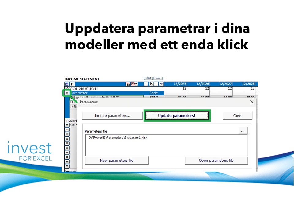 Invest for Excel® version 4.3 introducerar en ny parametertabell som kan läggas till i beräkningsfilerna, i en avsedd sektion i resultaträkningen. Parametrar kan matas in direkt eller hanteras via centraliserade parameterfiler, vilket gör det enklare att upprätthålla konsekventa antaganden i olika beräkningar och uppdatera värden effektivt.